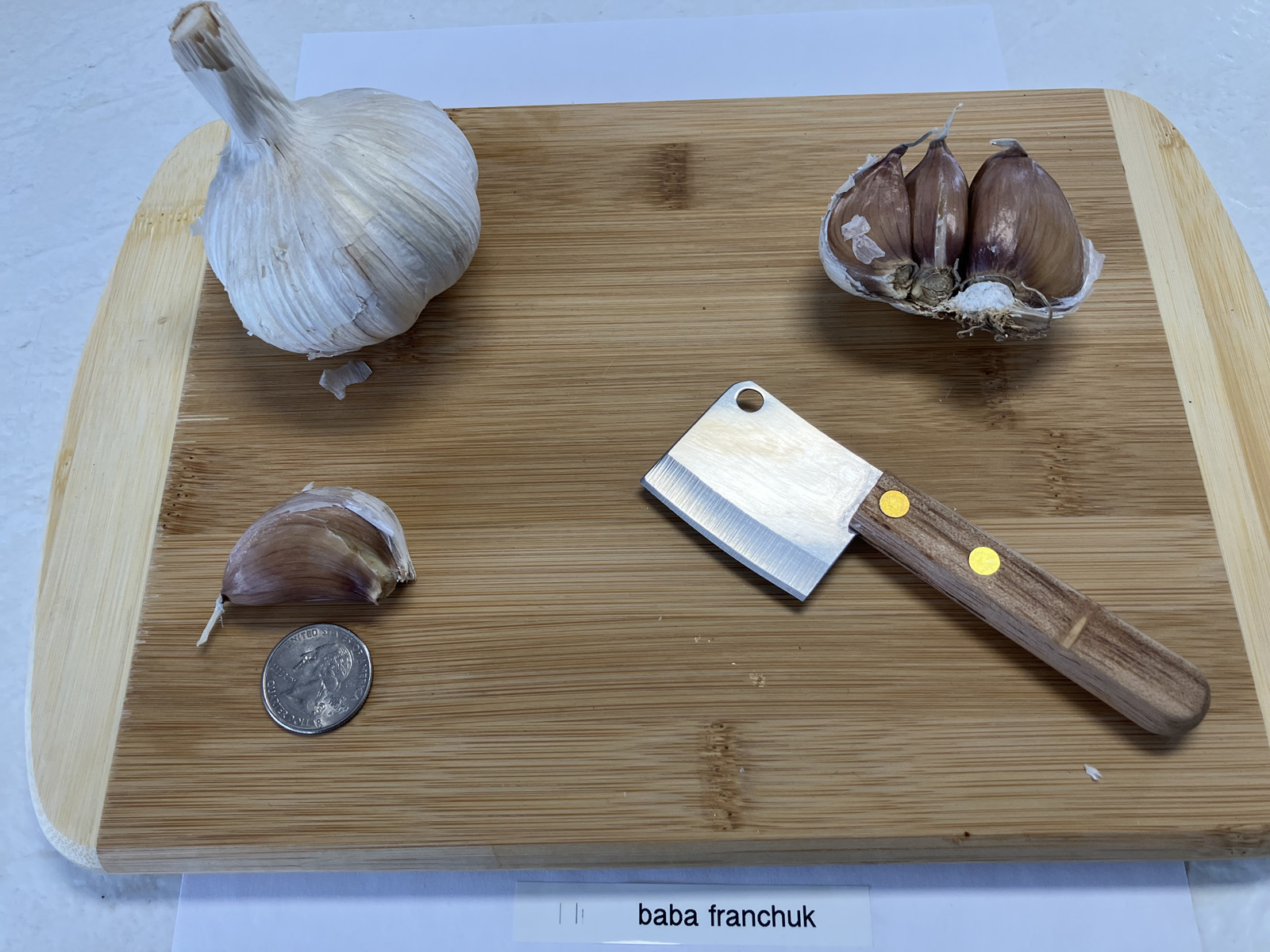 Baba Franchuk’s garlic is a premium hardneck variety from the Rocambole group, known for its robust bulbs. These garlic bulbs feature attractive wrappers with creamy white skins highlighted by vibrant purple flushes, adding visual appeal to their outstanding flavor.