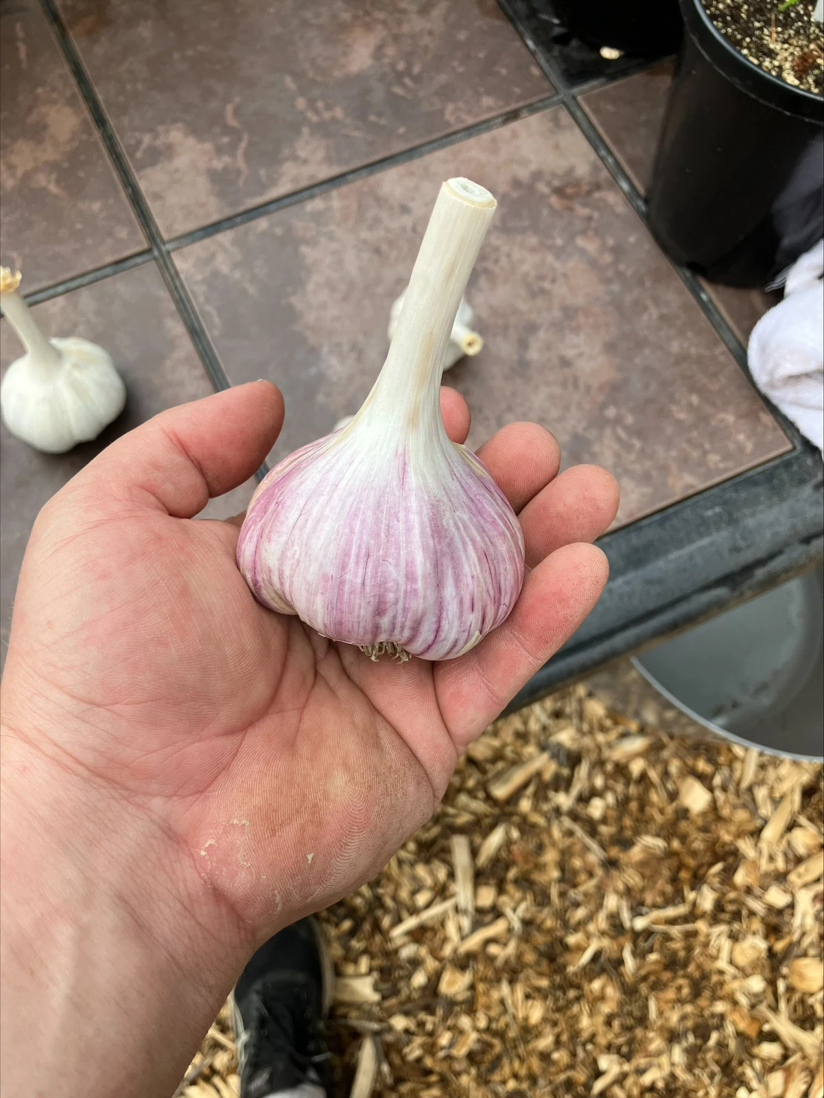 Chesnok garlic can grow quite large under excellent conditions. The outer bulb wrappers are thin and loose, but they become thicker and tighter as you peel them away, making the cloves easy to access. The cloves are large, milky white with cranberry-colored streaks, and have tannish elongated tips. Each large bulb typically has about a dozen cloves, even the inner ones being of good size.