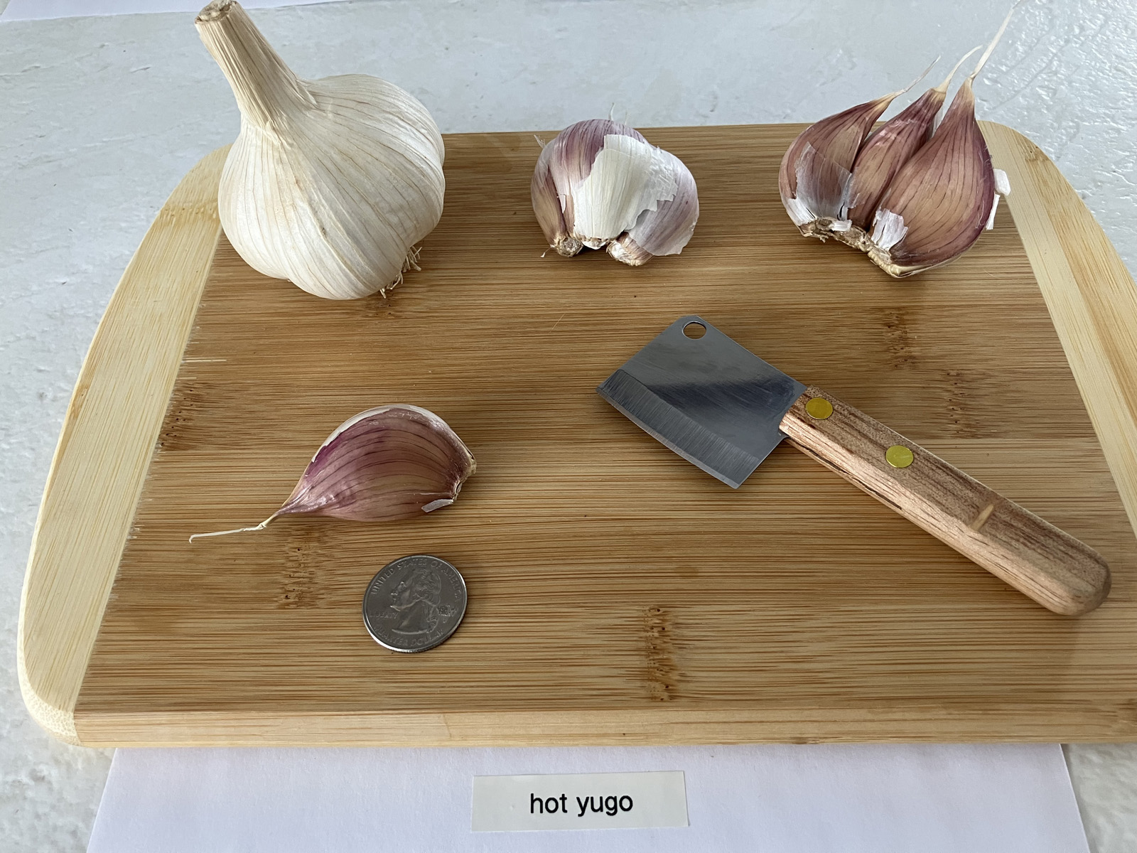 Hot Yugo garlic is a premium hardneck garlic from the Porcelain group, famed for its bold, spicy taste. Averaging 3-5 large cloves per bulb, its distinctive purple streaks and copper hues make it visually appealing and ideal for flavorful culinary dishes.